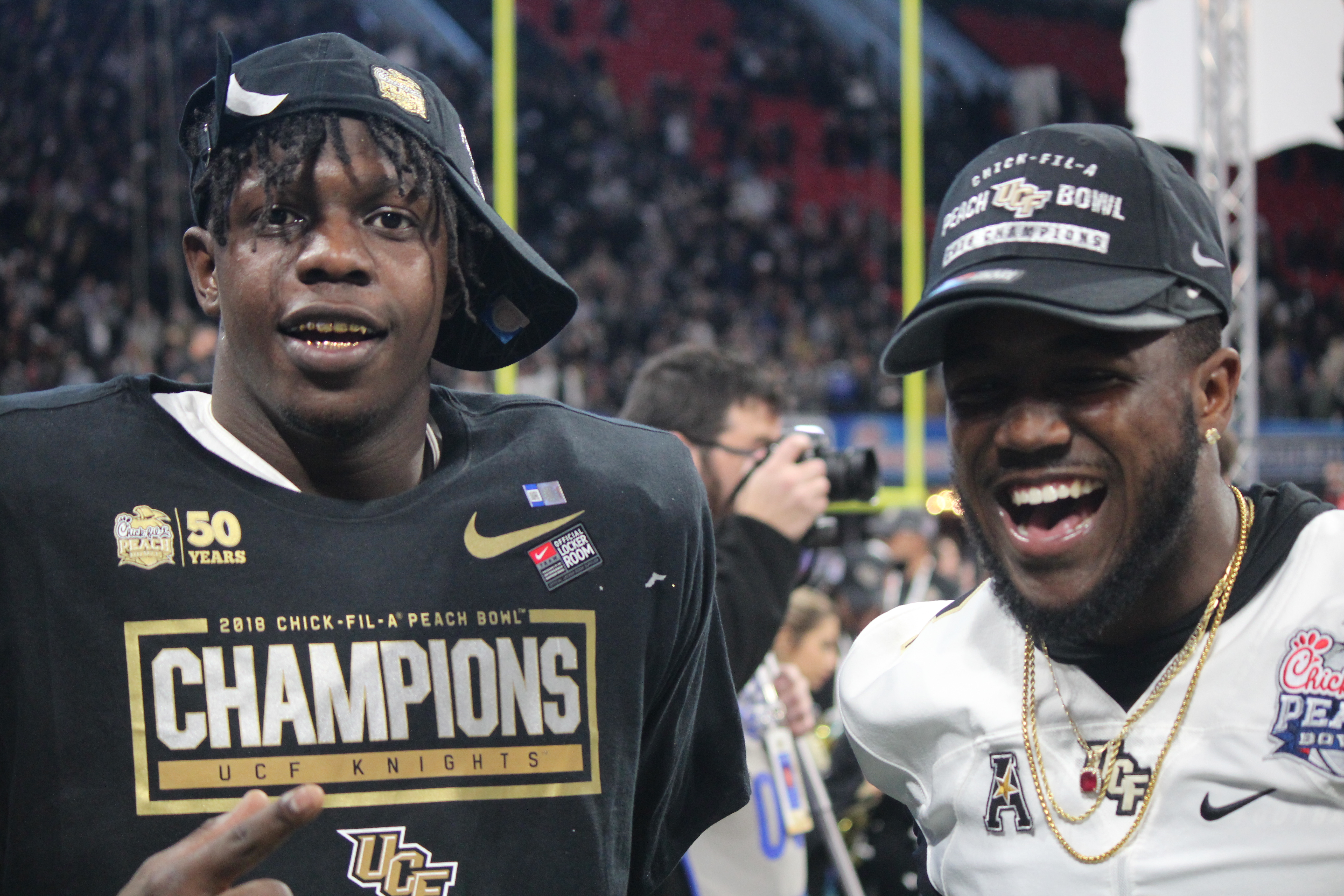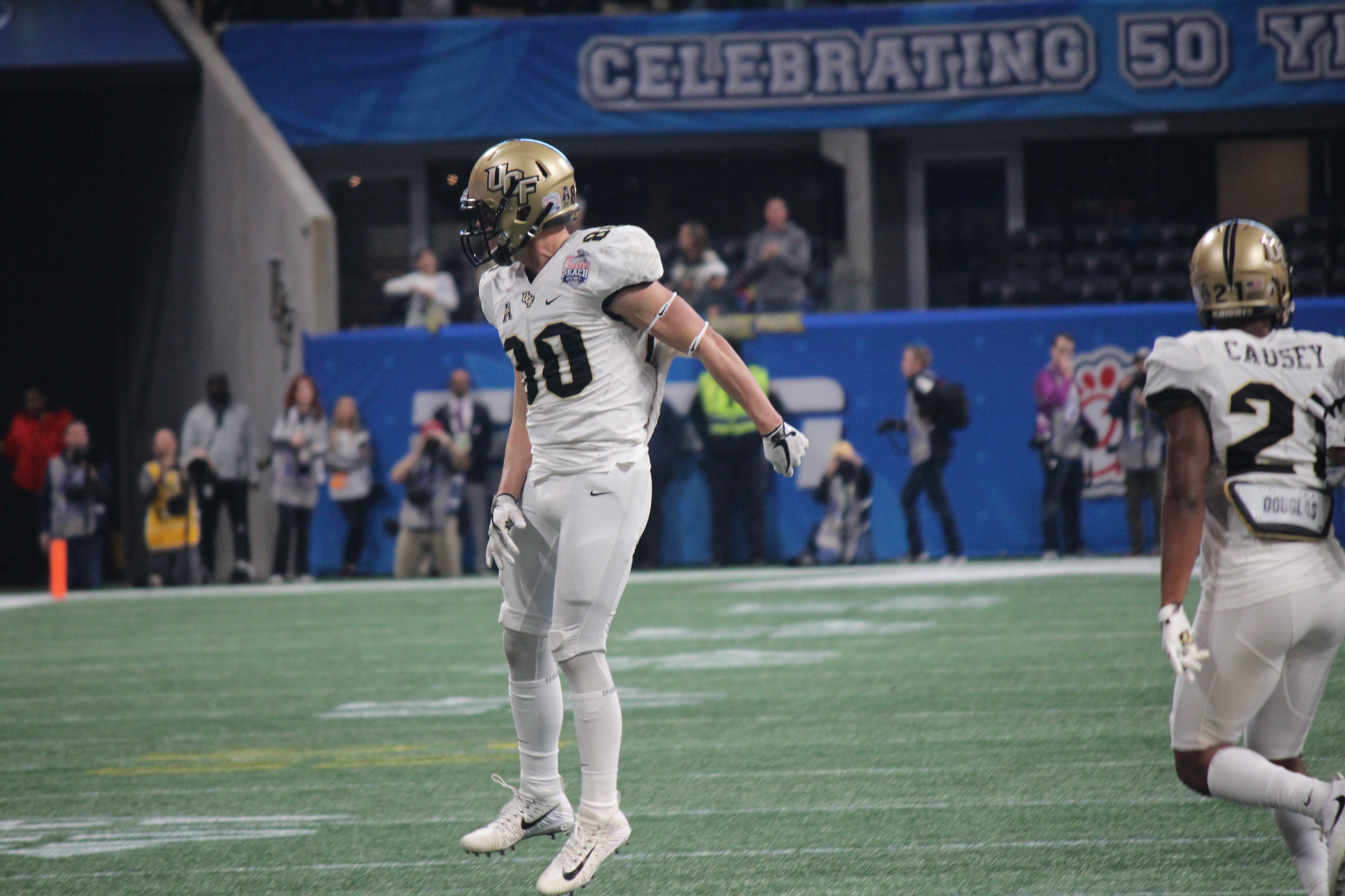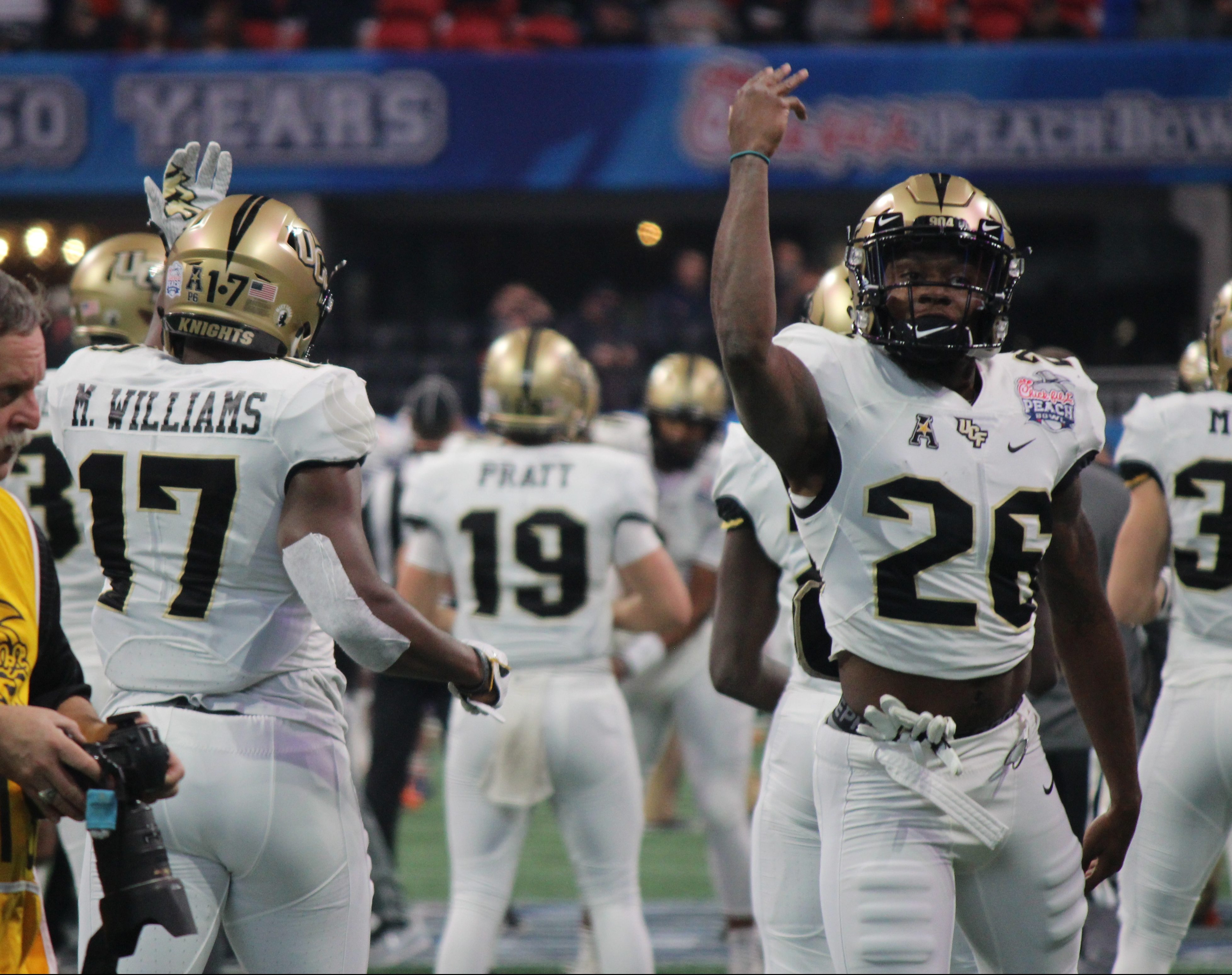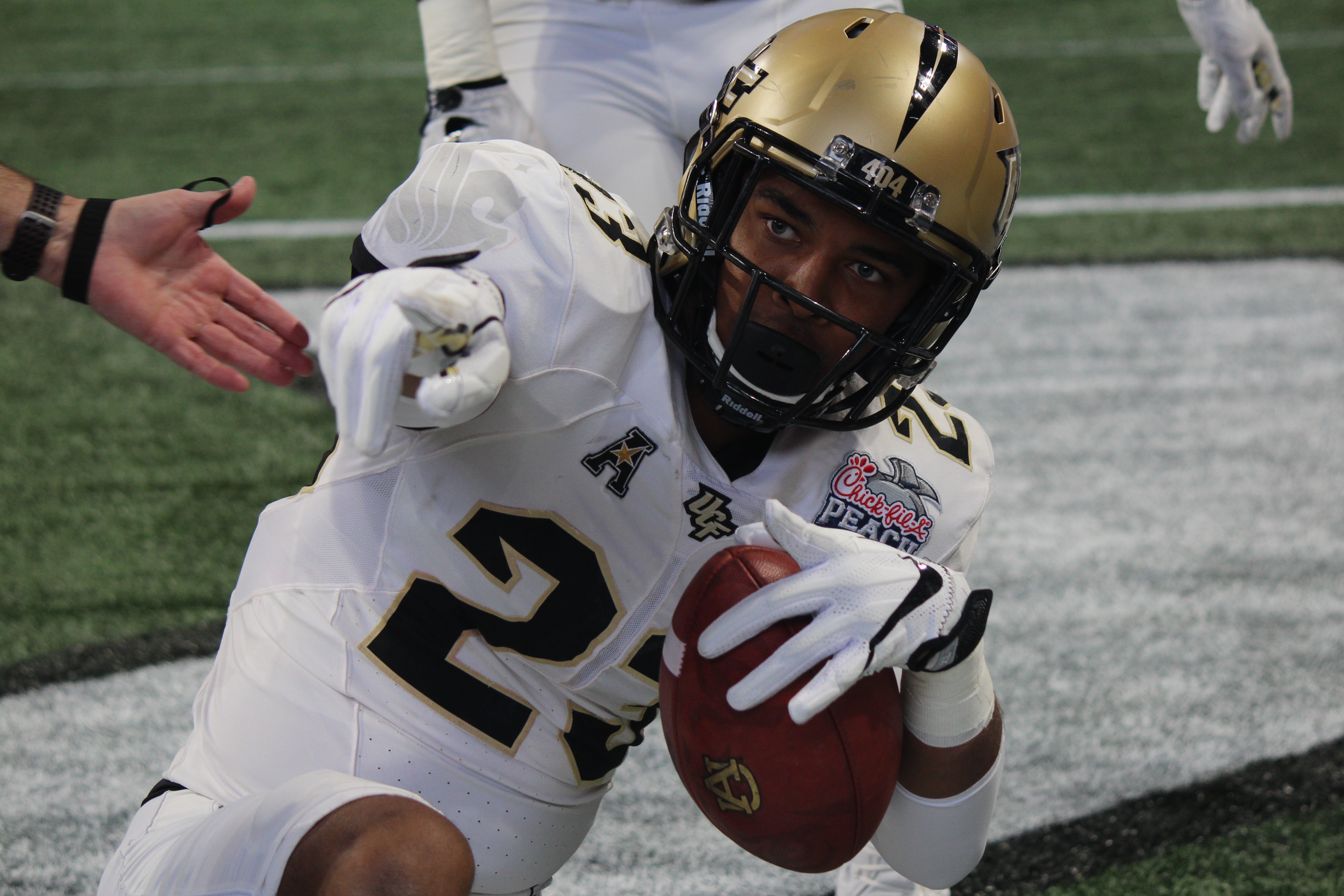 Jordan Akins flashes his UCF gloves after winning the Peach Bowl.