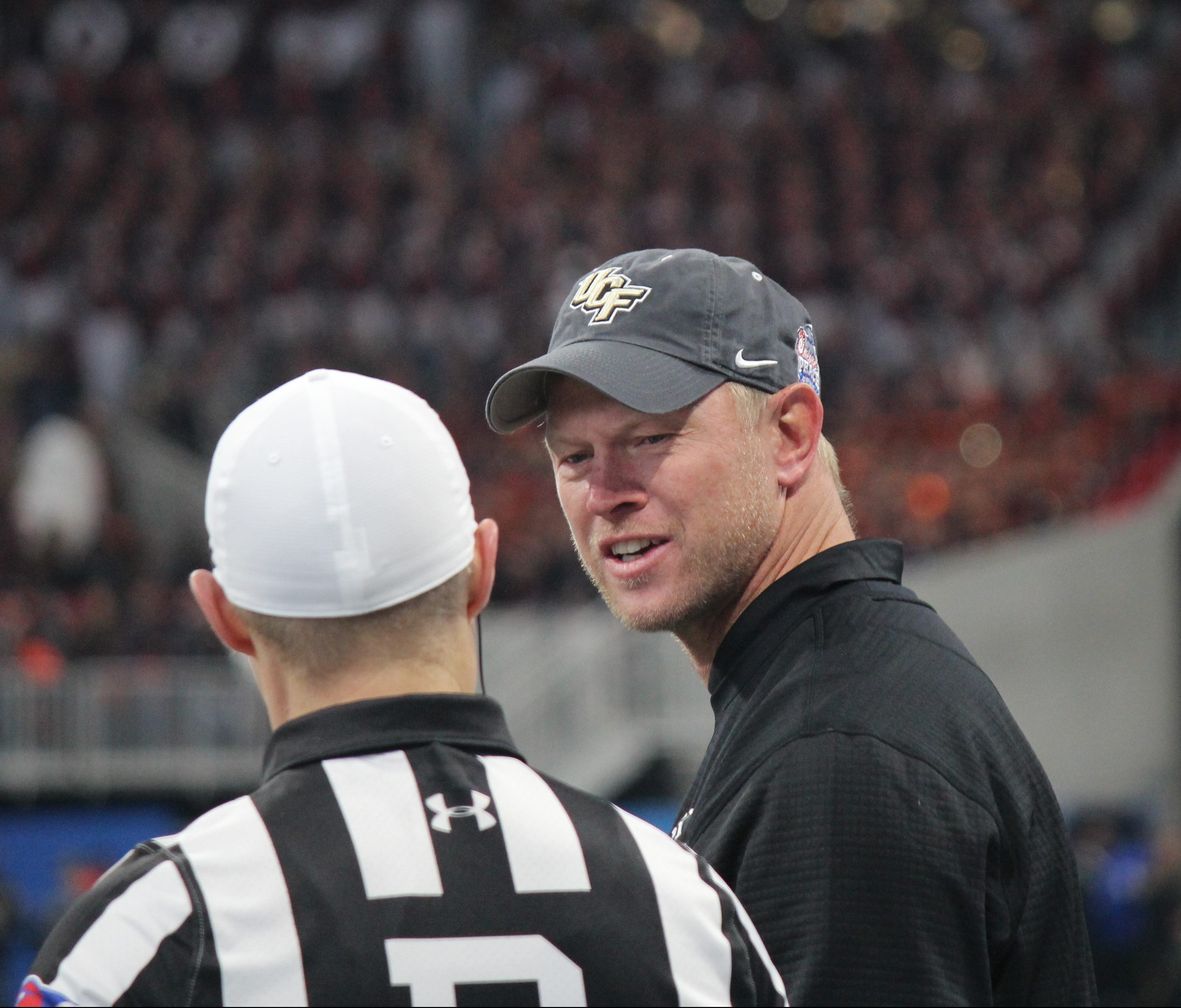 Scott Frost argues a call in the first half of the Peach Bowl.