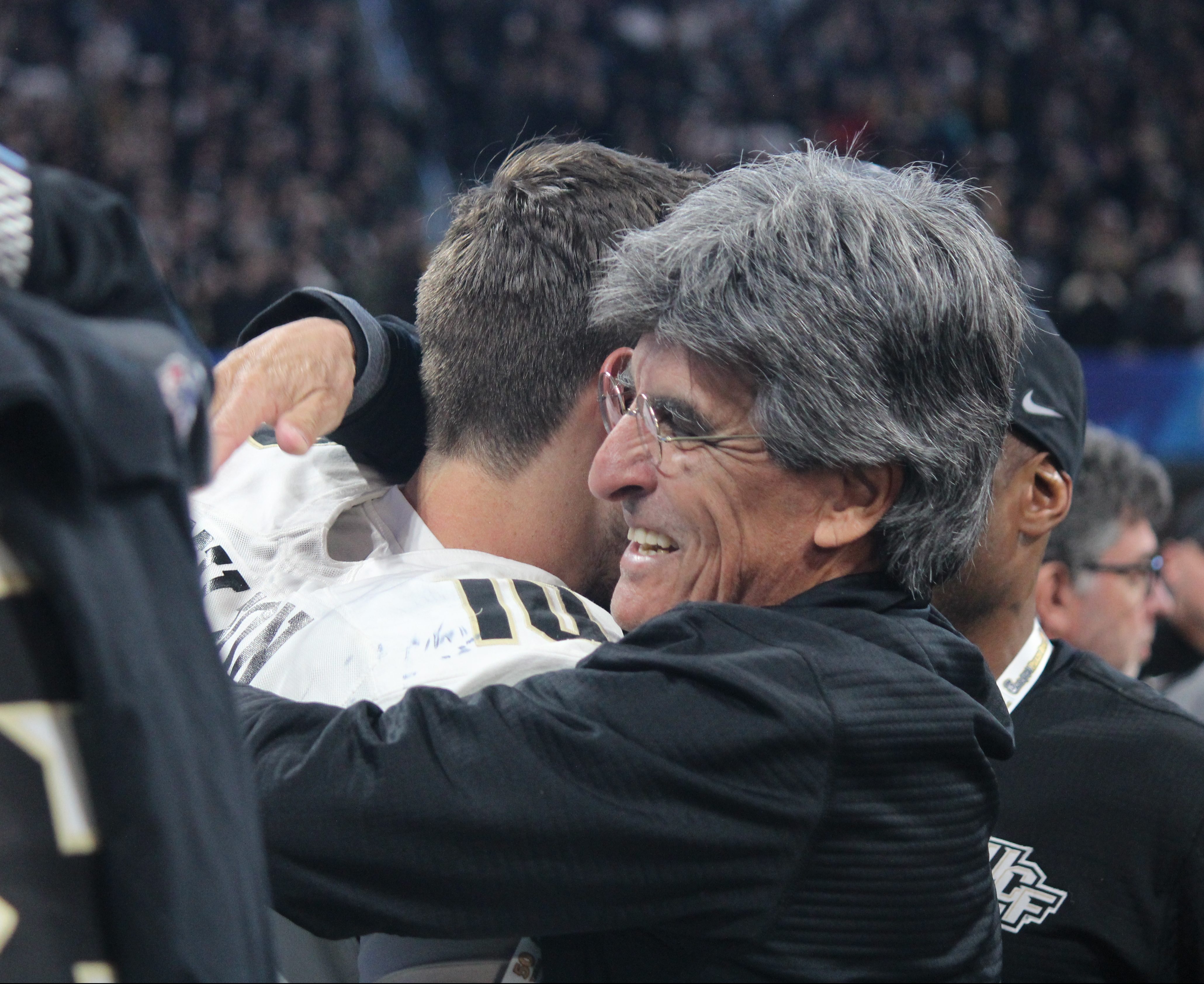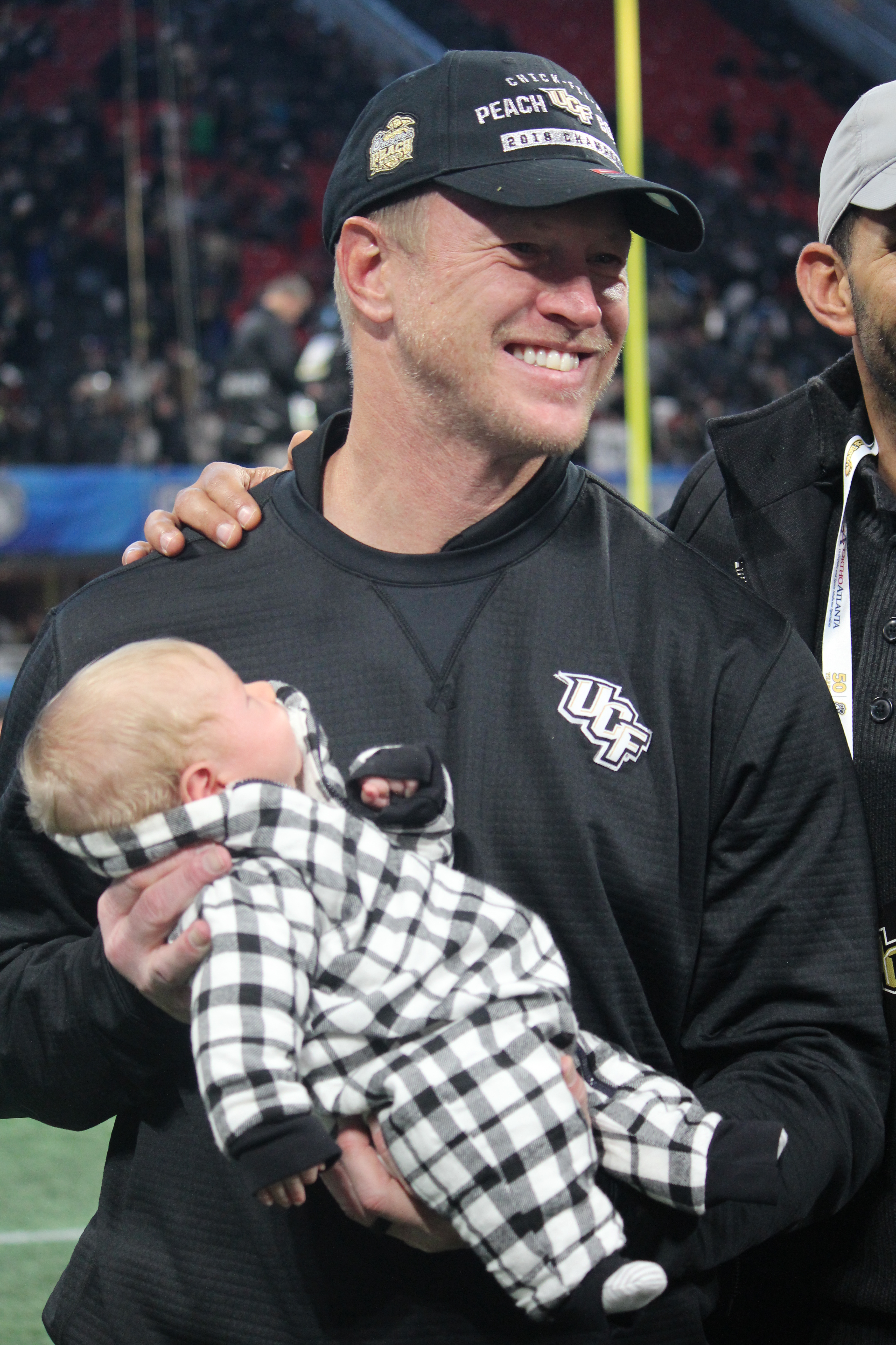 Scott Frost has a moment with his new born son after winning the Peach Bowl in his final game as UCF’s coach.