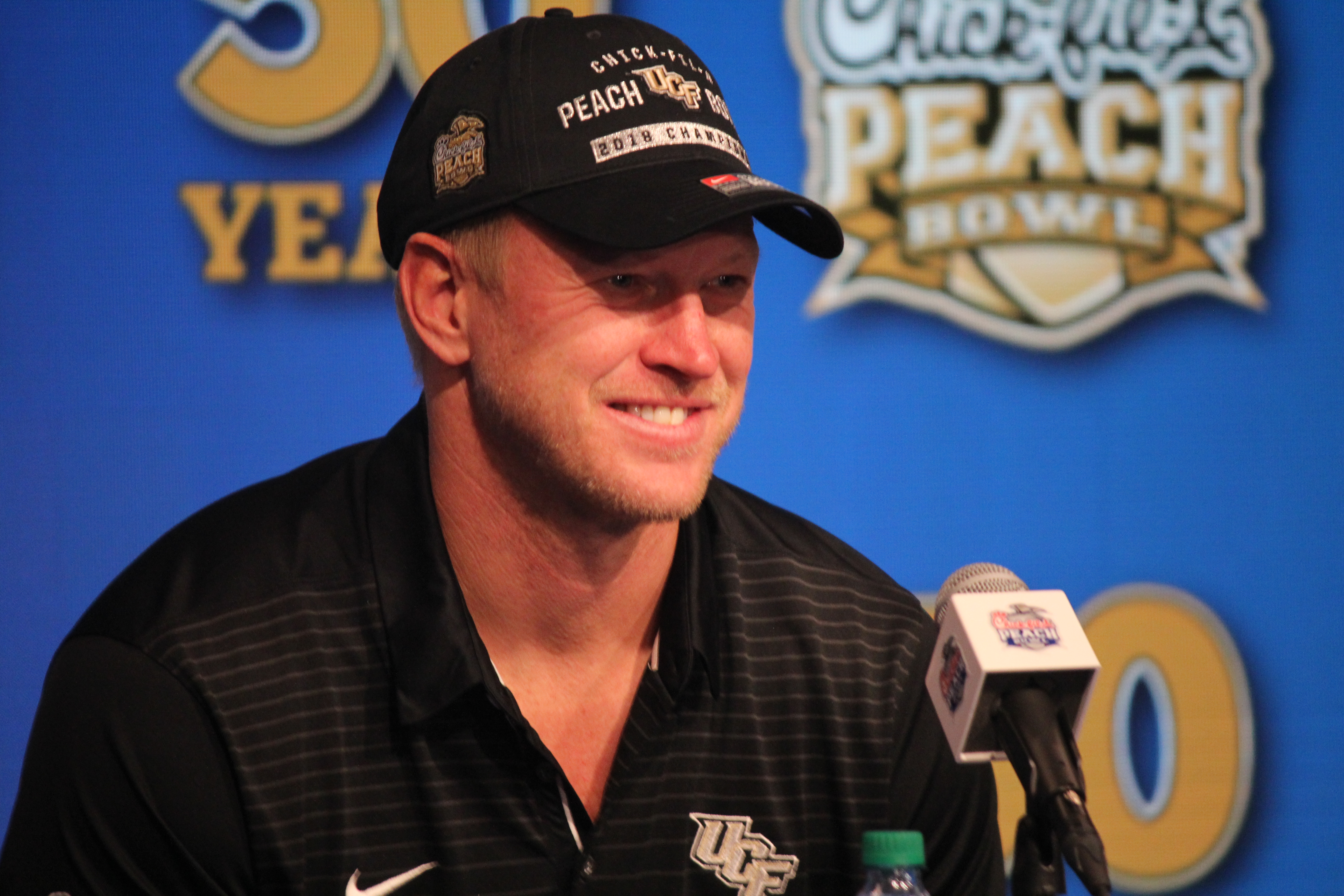 Scott Frost smiles as he answers a question after UCF’s Peach Bowl win over Auburn