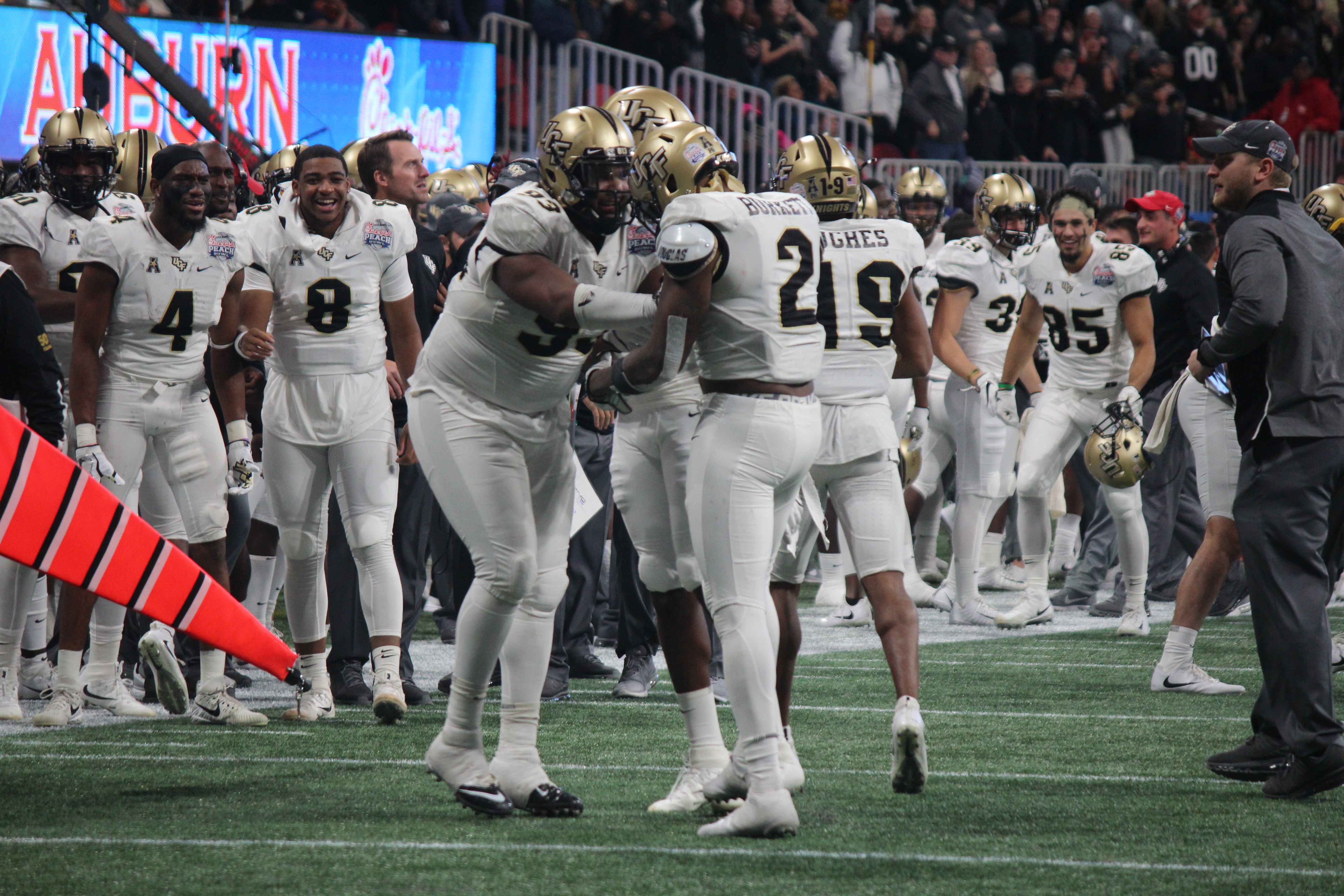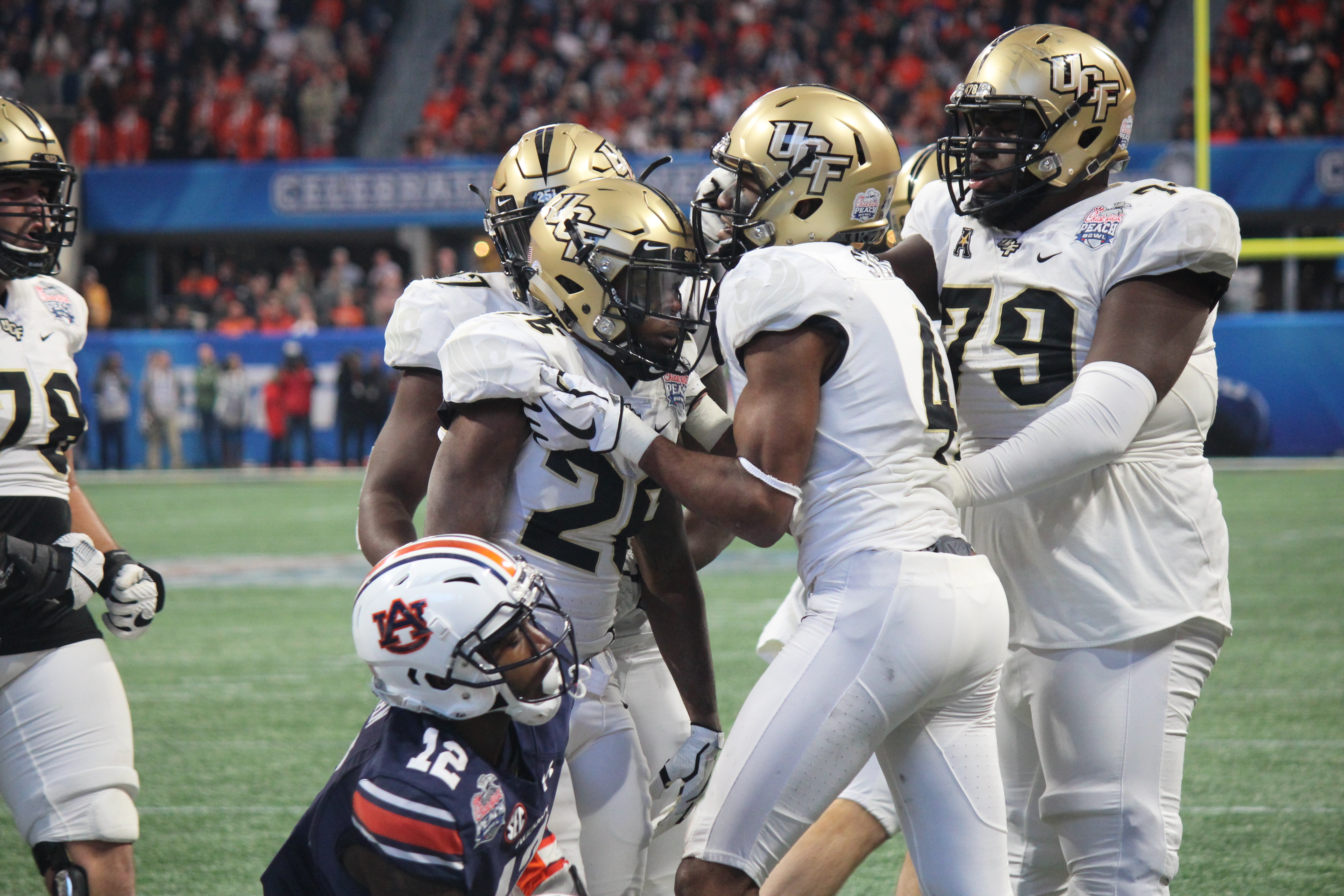 UCF players celebrate winning the Peach Bowl.