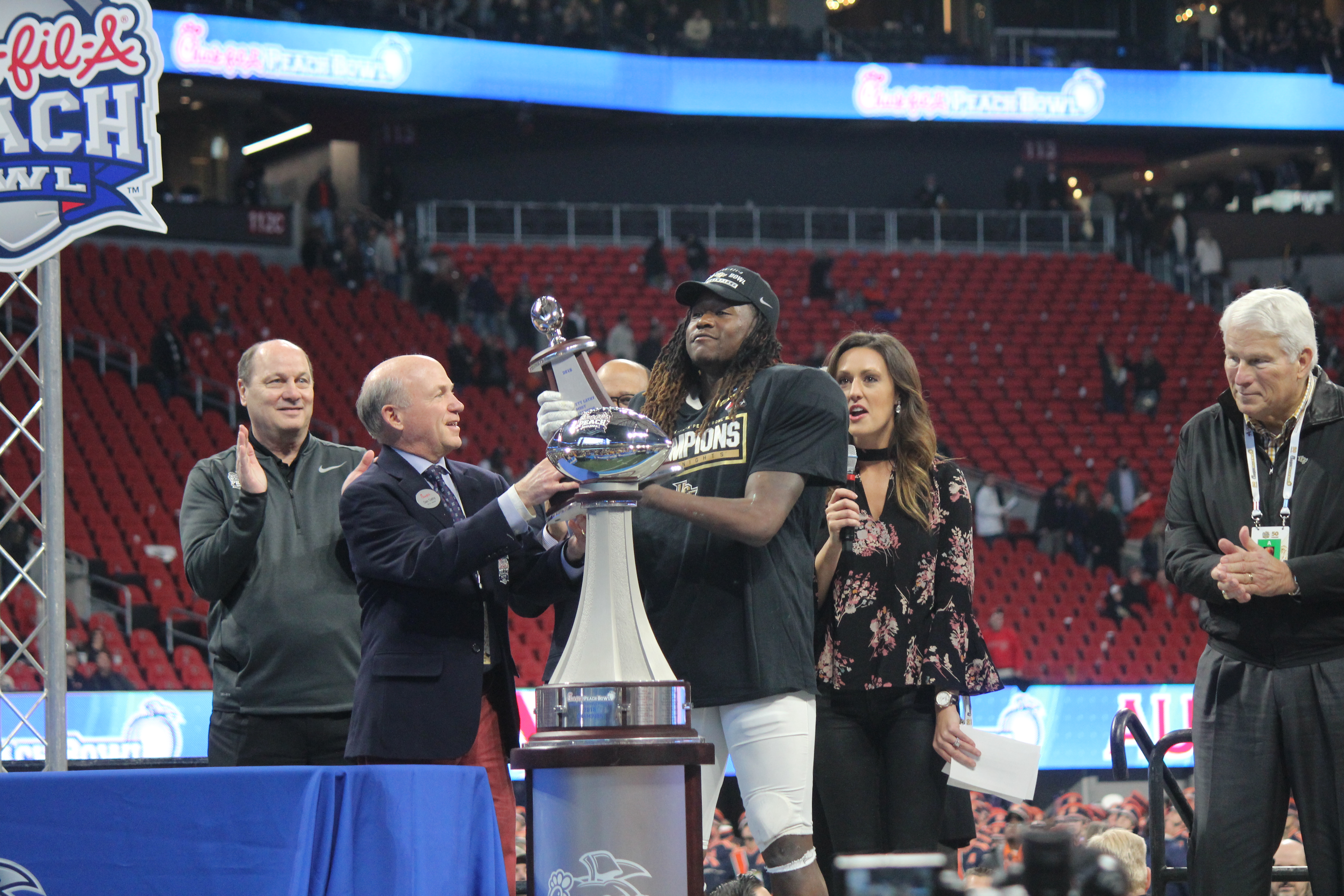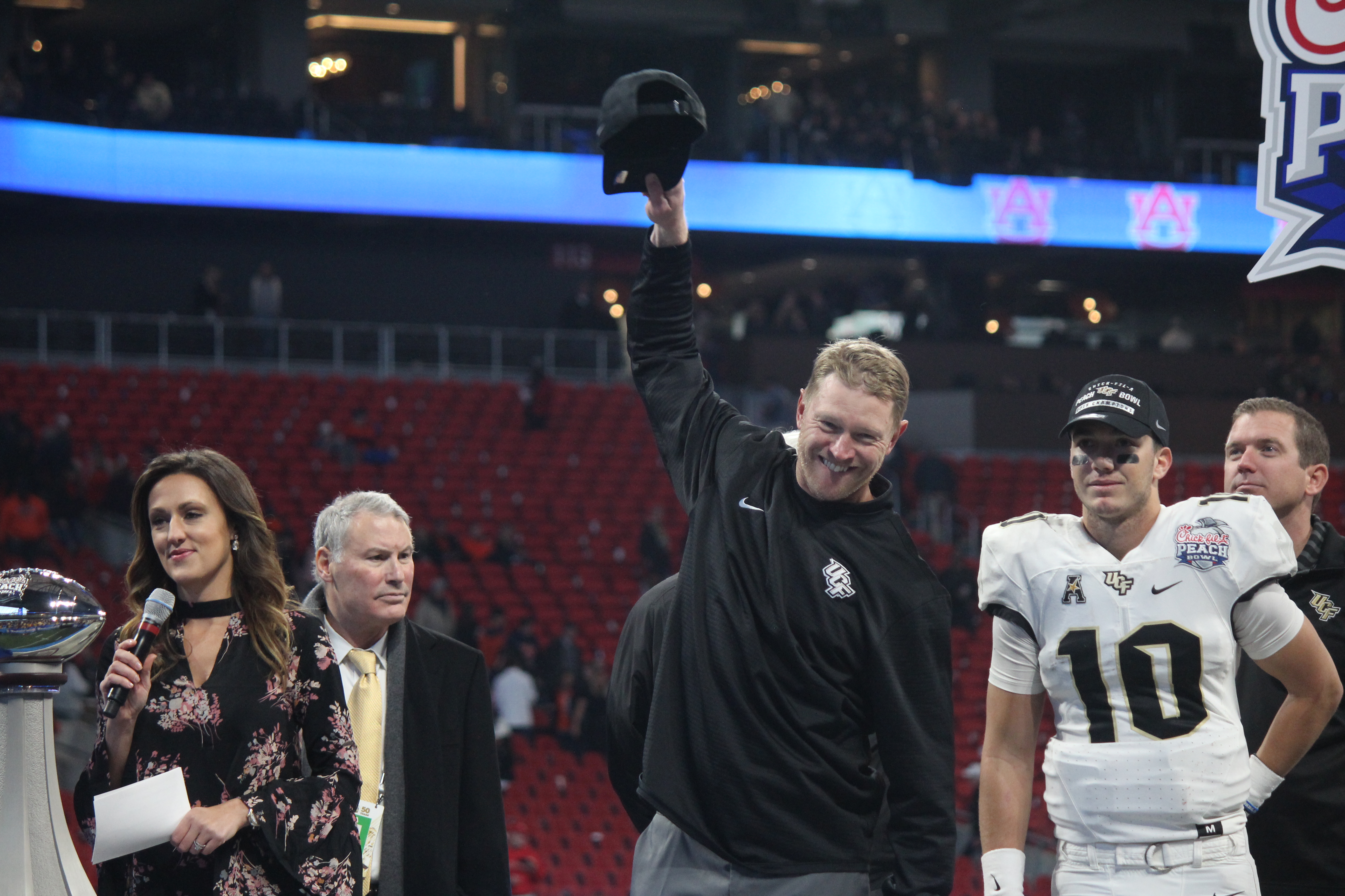 Griffin holds the Peach Bowl Trophy towards the UCF fans.