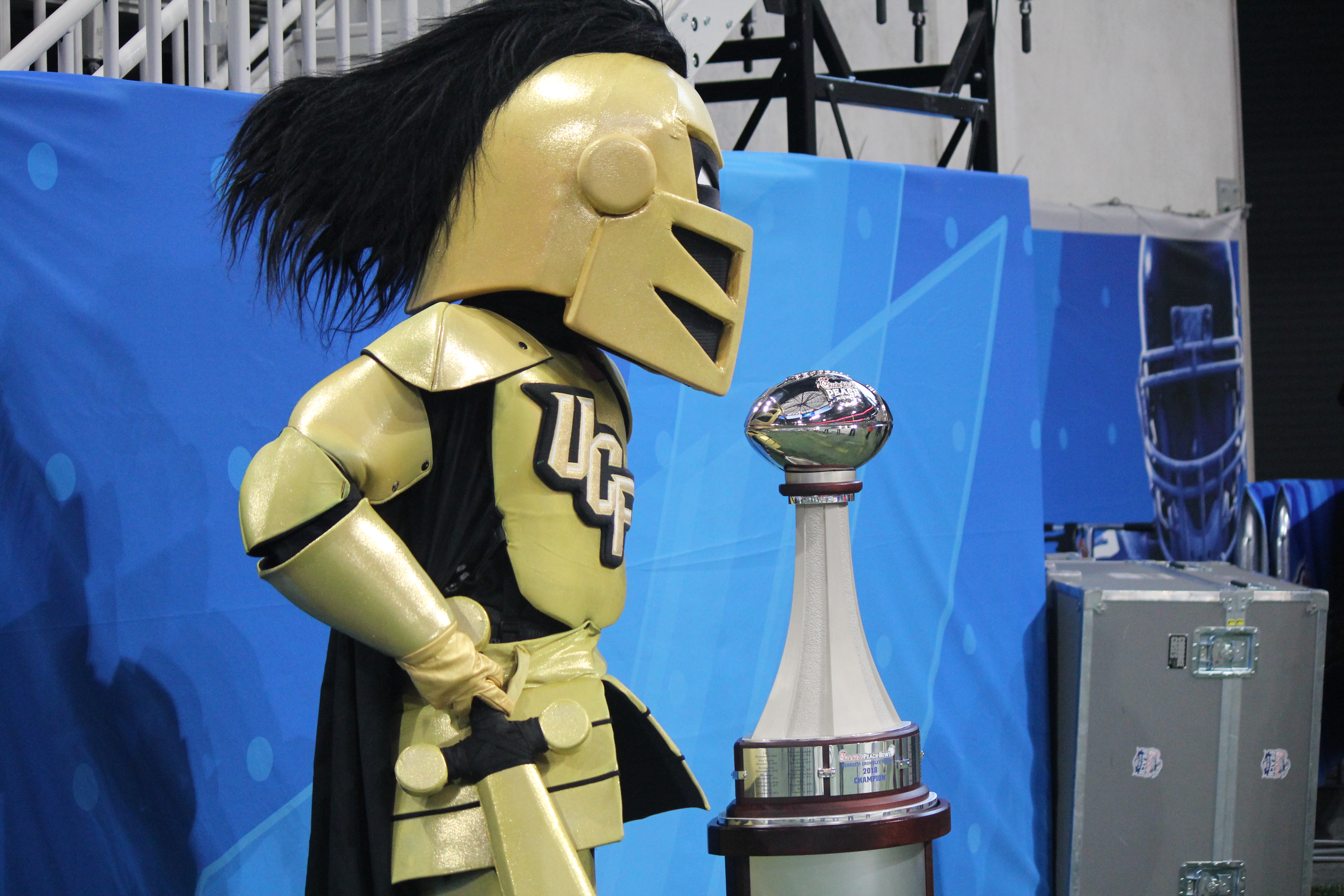 Knightro stares at the trophy in the second half of the Peach Bowl.