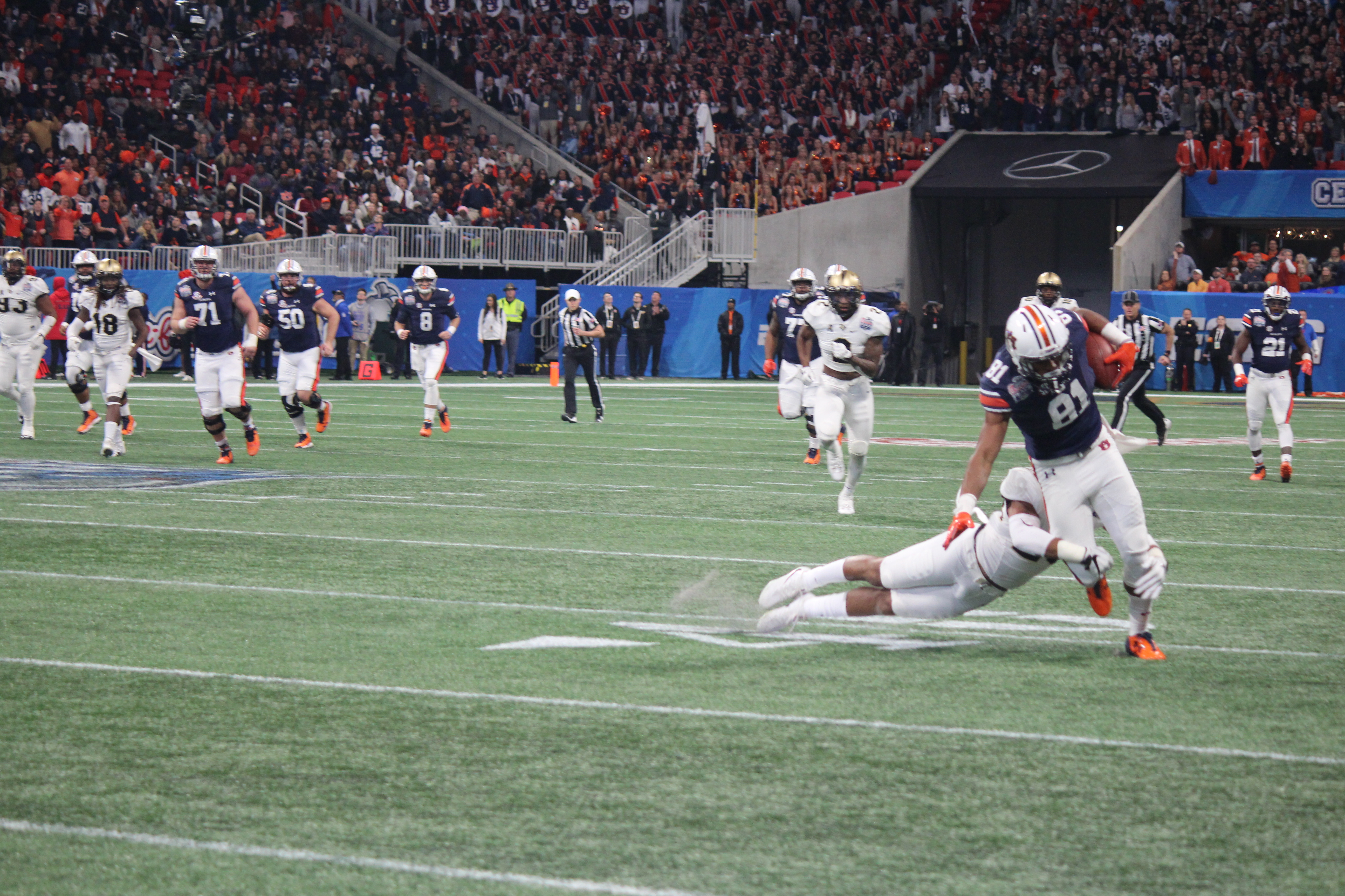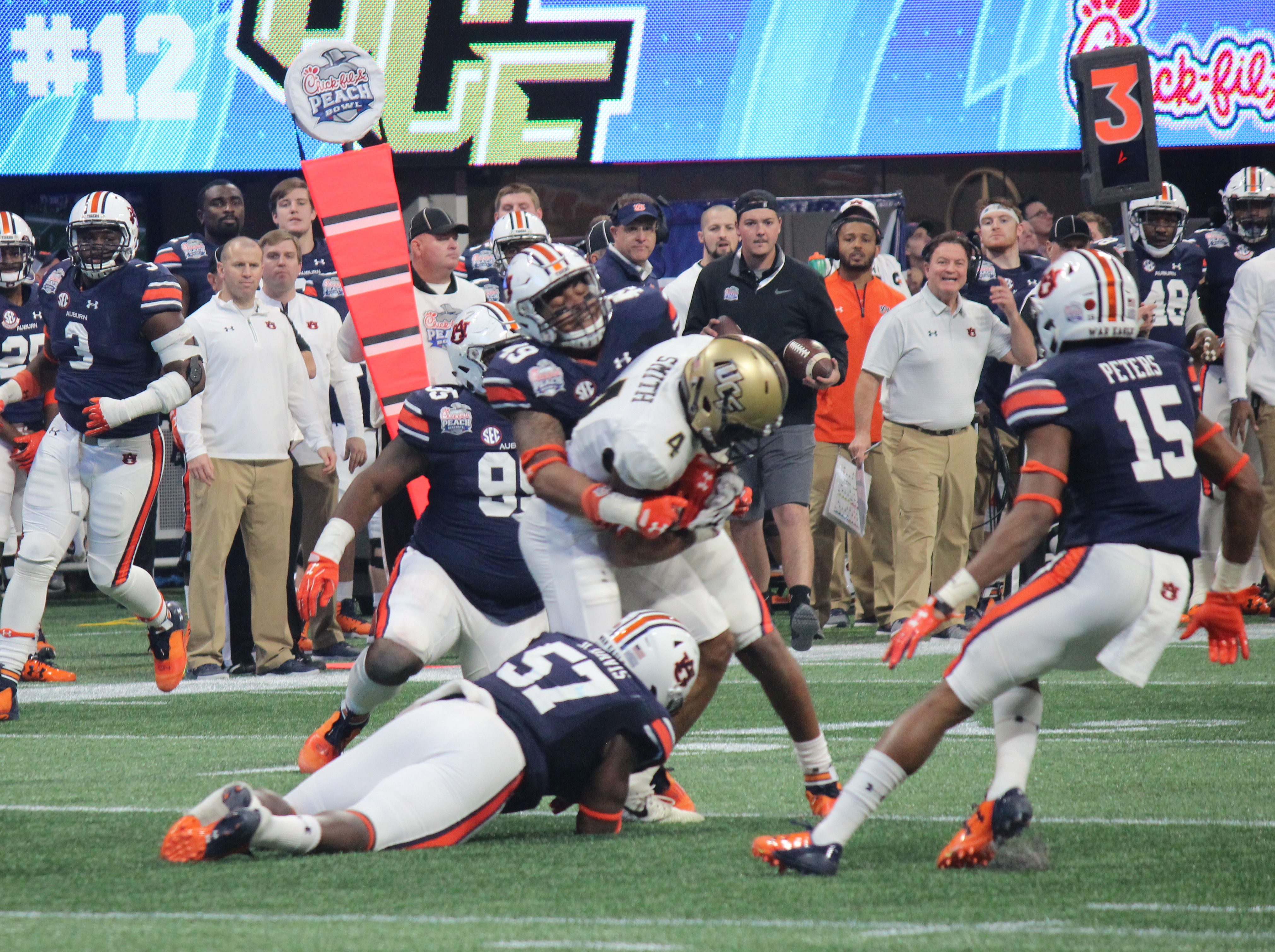 Safety Tre Neal makes a tackle in the first half of the Peach Bowl.