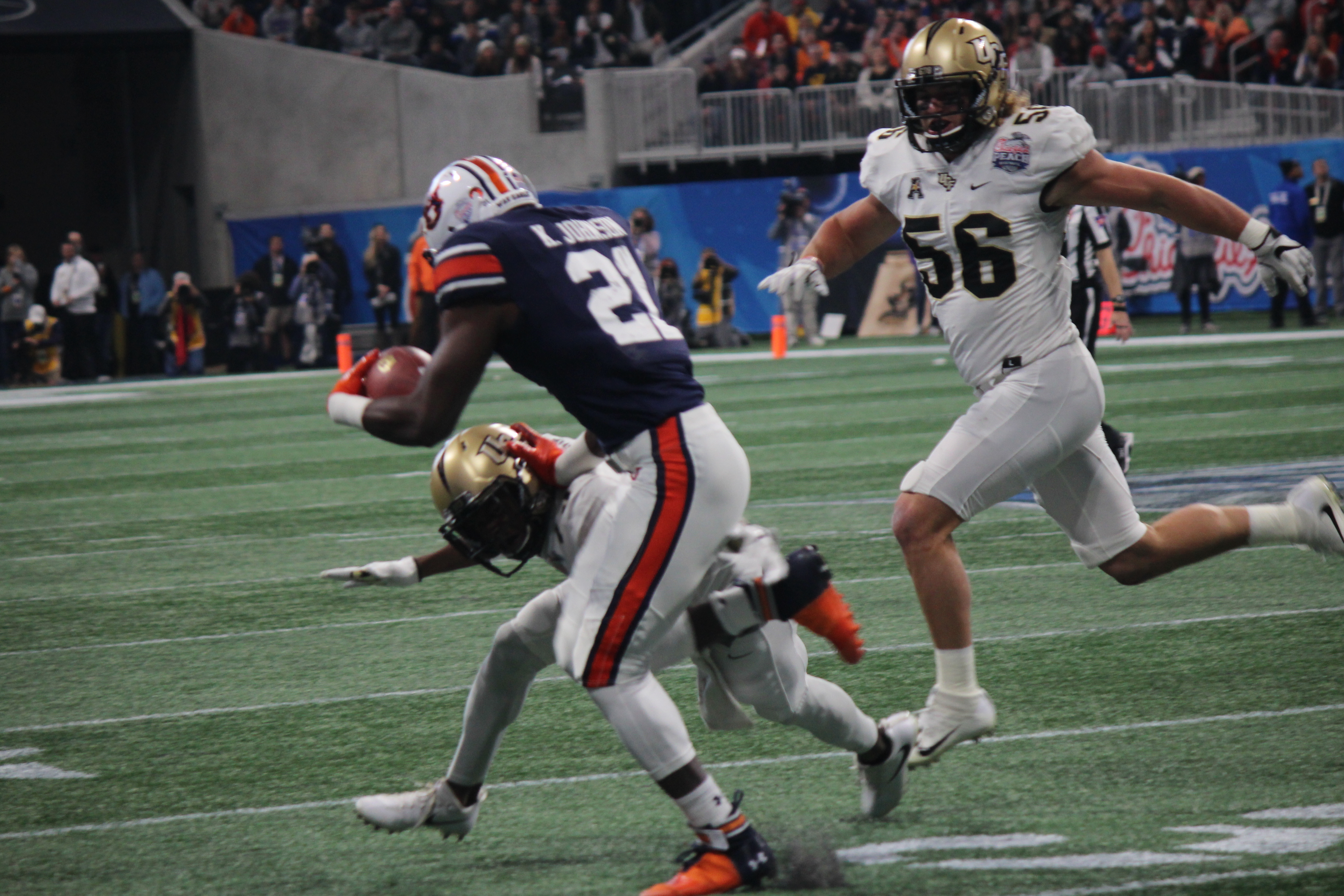 Tre Neal returning a fumble recovery in the first half of the Peach Bowl.
