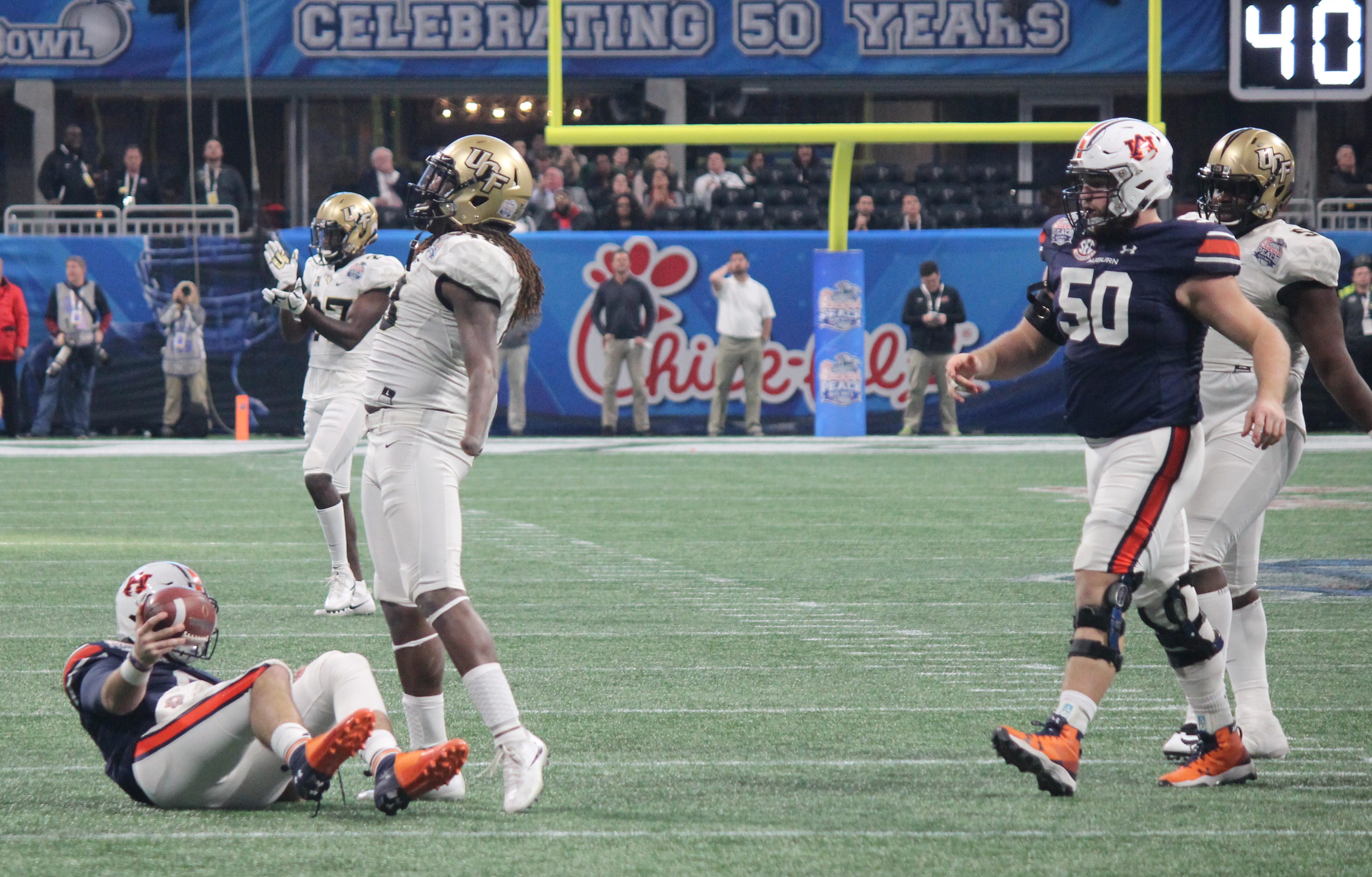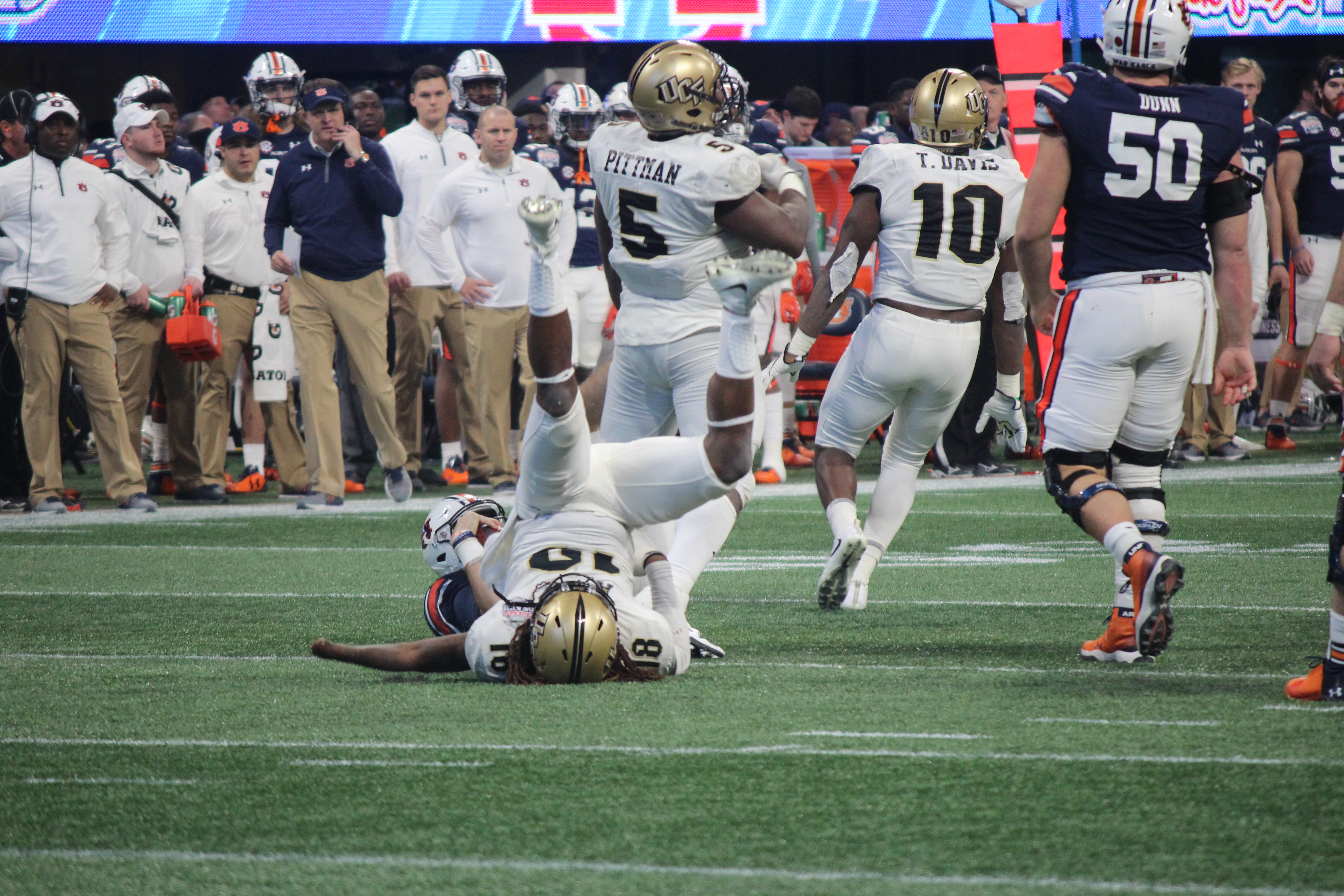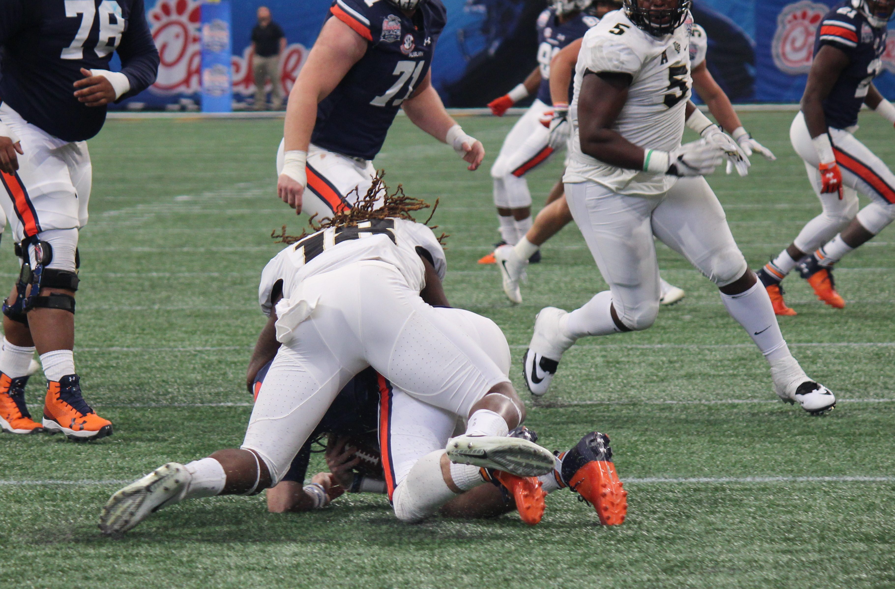 Jamiyus Pittman and Shaquem Griffin come up with a sack in the second half of the Peach Bowl.