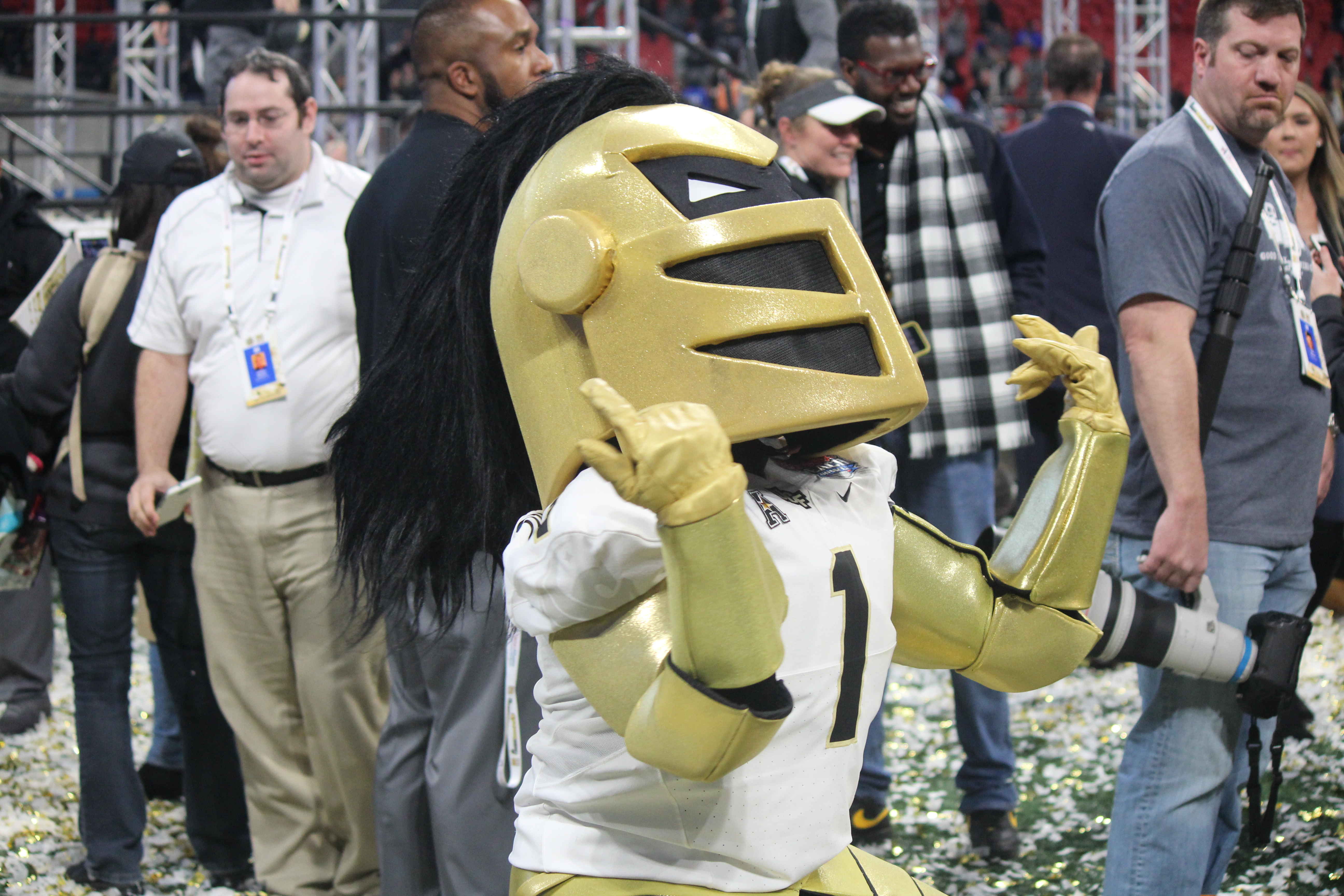 Knightro celebrates the Peach Bowl win.